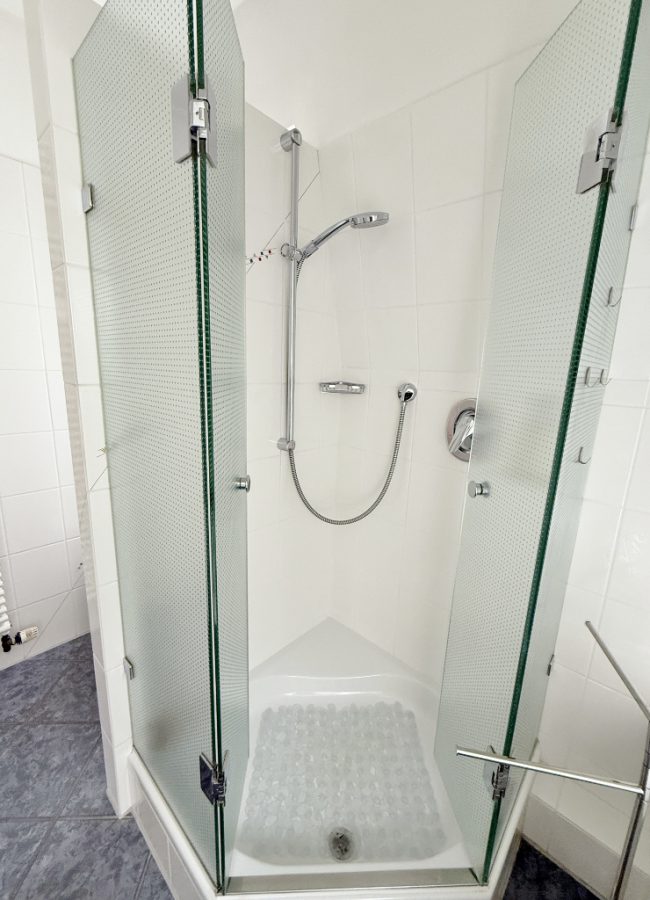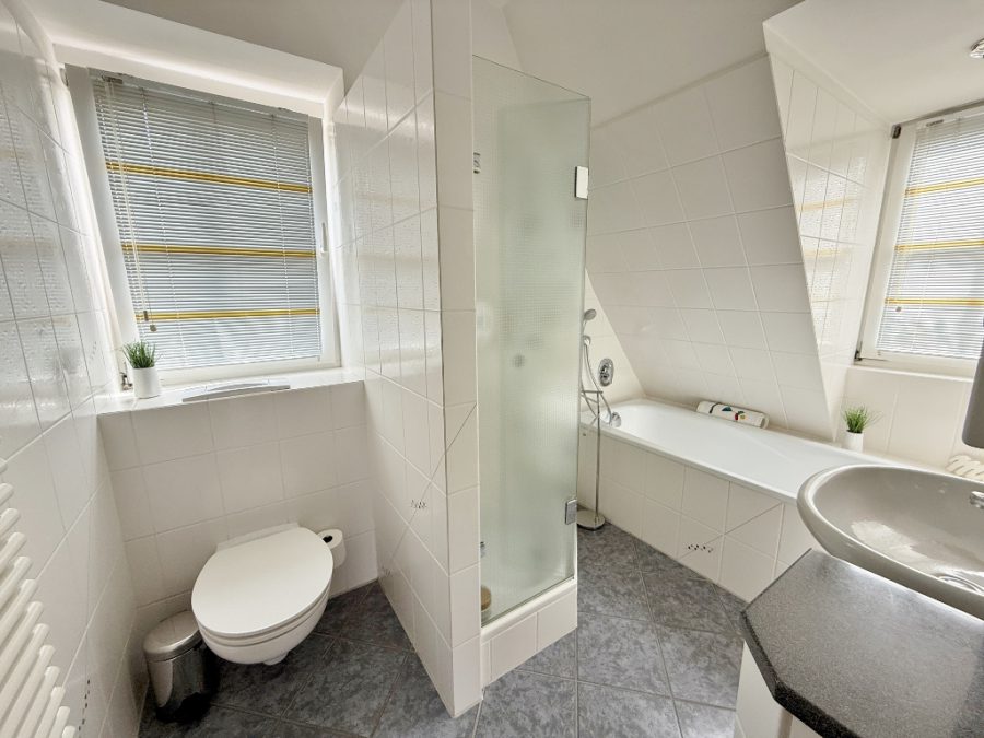 Die Küche ist mit einer modernen Einbauküche ausgestattet und bietet ausreichend Platz für einen Esstisch. Von hier aus gelangen Sie auf einen schmalen Balkon – ideal für frische Kräuter oder einen kleinen Sitzplatz. Das hell geflieste Tageslichtbad verfügt über eine Badewanne sowie eine separate Dusche – perfekt für die Bedürfnisse einer Familie.