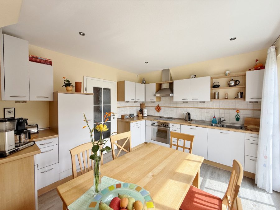 Die Küche ist mit einer hellen Einbauküche ausgestattet und bietet zusätzlich Platz für einen gemütlichen Essbereich. Von hier aus gelangen Sie direkt auf die angrenzende Frühstücksterrasse – der perfekte Ort für den Start in den Tag.