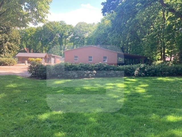 Das 10.000 m² große Grundstück ist parkähnlich angelegt und begeistert mit seinem alten Eichenbestand, der die lange Zufahrt säumt und dem Anwesen eine außergewöhnliche Atmosphäre verleiht. Eine große, massiv gebaute Doppelgarage sowie ein zusätzlicher Carport bieten ausreichend Stellfläche für mehrere Fahrzeuge.