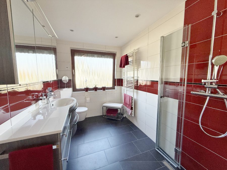 Das 2013 modernisierte Duschbad besticht durch helle Wandfliesen mit roten Akzenten und einem anthrazitfarbenen Boden, während ein ebenerdiger Duschbereich zusätzlichen Komfort bietet.