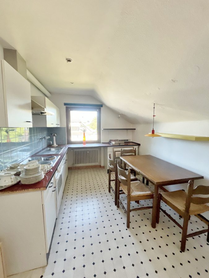 Die Küche ist mit praktischen Einbauten versehen und bietet Platz für einen kleinen Essbereich.