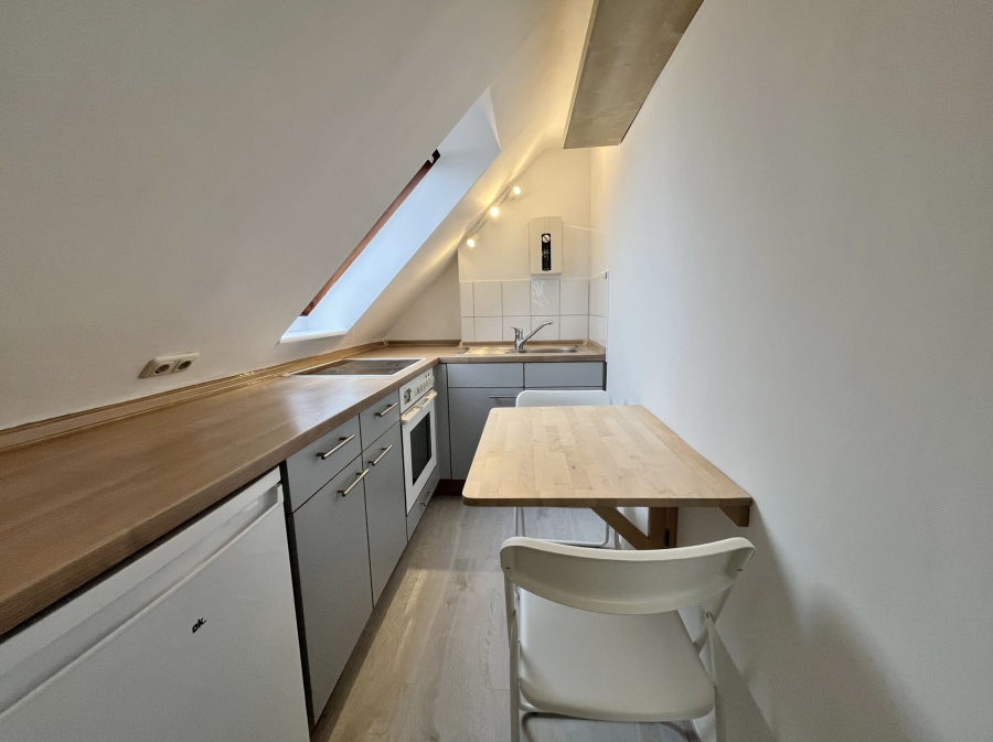 Der Wohn-/Schlafbereich ist mit neuen Möbeln ausgestattet und bietet trotz der Dachlage ein angenehmes Wohngefühl. Eine kleine Garderobe findet im Eingangsbereich Platz und schafft zusätzlichen Stauraum. Die separate Küche wurde kürzlich modernisiert und verfügt über einen neuen Herd sowie einen neuen Kühlschrank. Sie ermöglicht, zu zweit am ausklappbaren Tisch gemütlich zu frühstücken.