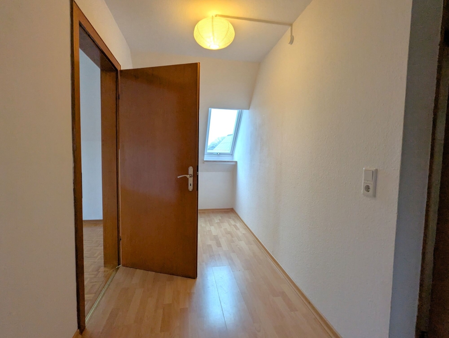 Die Wohnung ist über einen eigenen, separaten Eingangsbereich erreichbar. Ein ordentliches und gepflegtes Treppenhaus führt in das Dachgeschoss. Der zentrale Flur bildet das Herzstück der Wohnung und bietet Zugang zu nahezu allen Räumen.