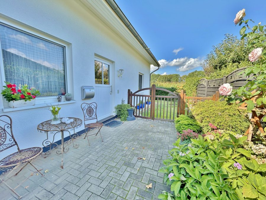 Das angrenzende Wohnzimmer bietet genügend Platz, jede Wohnlandschaft unterzubringen und ist durch die bodentiefen Fensterelemente besonders lichtdurchflutet. Von hier aus haben Sie zudem Zugang zur überdachten Terrasse, die ein besonderes Highlight darstellt. Im Sommer grillen, im Winter trotz Schnee draußen sitzen, denn hier ist genügend Platz für Familie und Freunde. Um die Terrasse herum ist es überall grün, denn zur Wohnung gehört auch der große Garten. Dieser ist mit viel Rasenfläche aktuell pflegeleicht angelegt und bietet viel Raum für kreative Gartenfans.