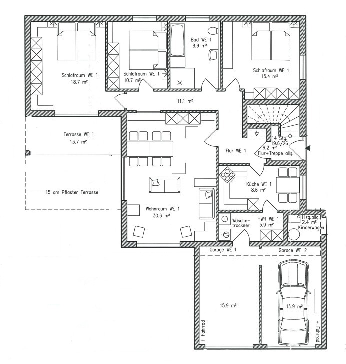 - zwei mögliche Außenstellplätze vor den Garagen