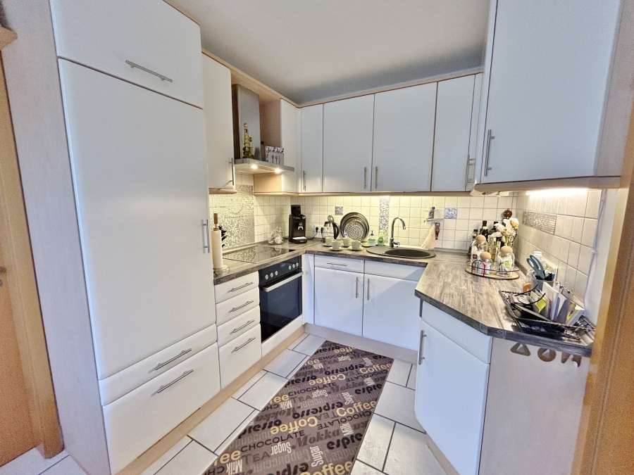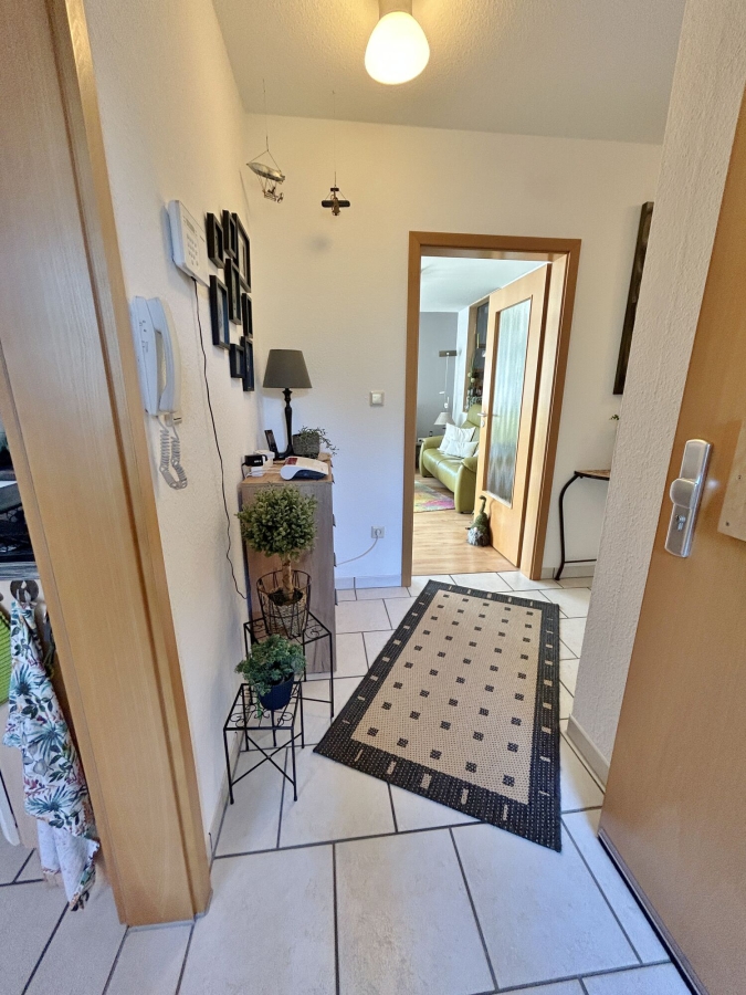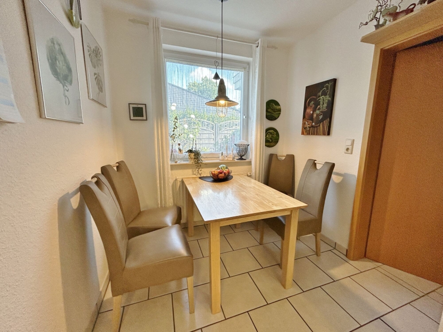 Über den gemeinsamen Hauseingang erreichen Sie die Wohnungstür. Ein Wohnungsflur in Z-Form führt Sie direkt in alle Räume der Wohnung. Zur Rechten finden Sie die Garderobe, welche genügend Platz für alle Schuhe und Jacken bietet. Zur Linken gelangen Sie in die separate Küche. Diese ist bereits mit einer schicken Einbauküche versehen, die Fronten wurden erst 2020 komplett neu lackiert. Ebenfalls wurden die E-Geräte 2024 erneuert. Auf der linken Seite ist genügend Platz für einen großzügigen Frühstückstisch. Wer es lieber offen mag, kann mit einer Öffnung die Küche und das Wohnzimmer verbinden.