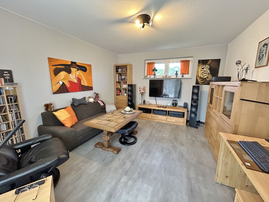 Das angrenzende Wohnzimmer bietet genügend Platz, jede Wohnlandschaft unterzubringen und ist durch die bodentiefen Fensterelemente besonders lichtdurchflutet. Von hier aus haben Sie zudem Zugang zur überdachten Terrasse, die ein besonderes Highlight darstellt. Im Sommer grillen, im Winter trotz Schnee draußen sitzen, denn hier ist genügend Platz für Familie und Freunde. Um die Terrasse herum ist es überall grün, denn zur Wohnung gehört auch der große Garten. Dieser ist mit viel Rasenfläche aktuell pflegeleicht angelegt und bietet viel Raum für kreative Gartenfans.