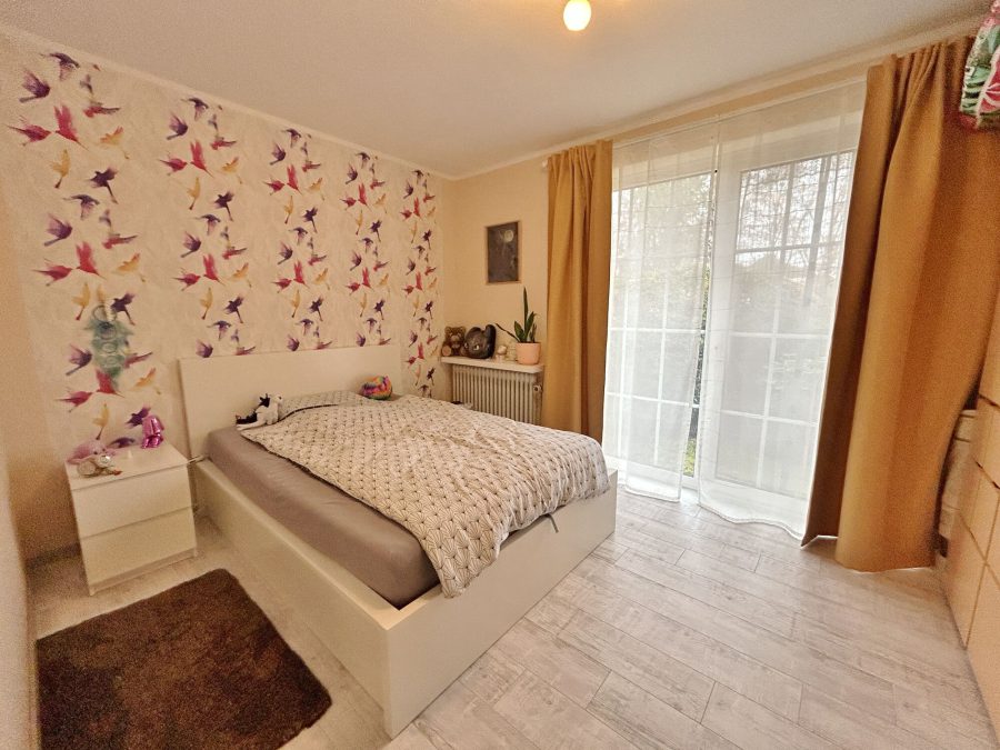 Das Schlafzimmer bietet mit dem rechteckigen Schnitt genügend Platz für Bett und Schrank. Nicht nur hier, sondern in der gesamten Wohnung wurden 2022 abschließbare, bodentiefe Kunststofffenster verbaut. Mit 3-fach-Verglasung sind diese nun auf dem neusten technischen Stand und die Sprossen verleihen ein gemütliches Ambiente.