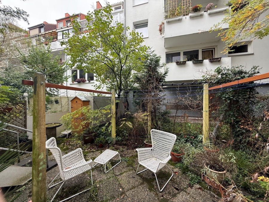 Der kleine Hofgarten ist zur alleinigen Nutzung und hat, genau wie der Balkon, am Nachmittag Sonne.