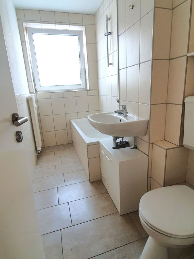 - hell gefliestes Badezimmer mit Badewanne, WC und Waschbecken