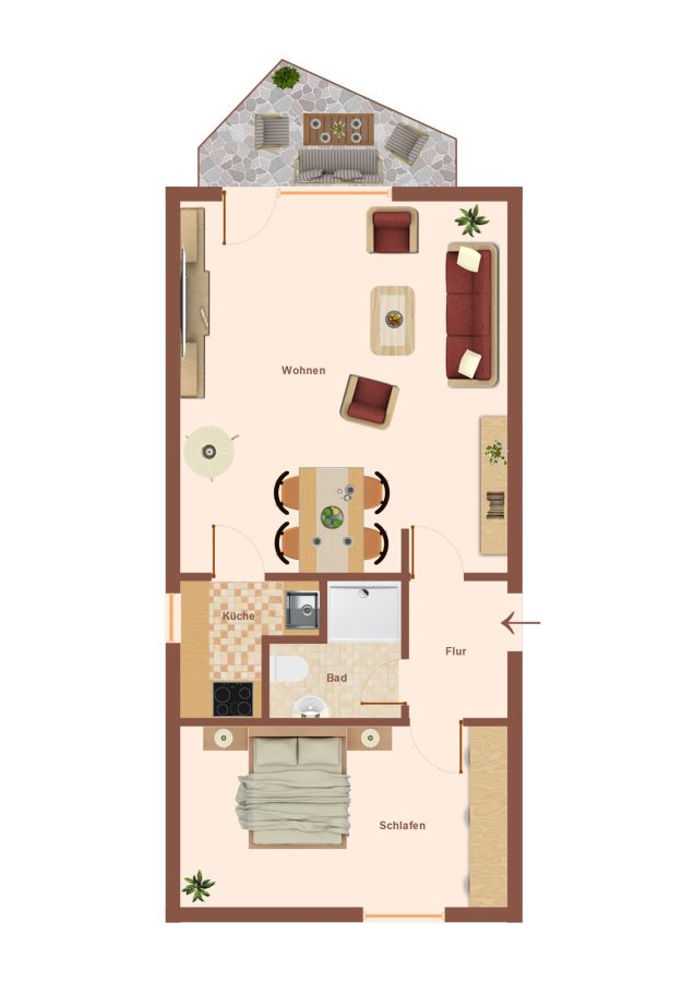 Das Schlafzimmer befindet sich zur linken Flurseite und bietet durch den rechteckigen Schnitt genügend Platz für Ihr Bett und eine große Schrankwand.