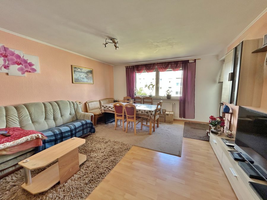 Der rechteckige Wohn-/Essbereich umfasst ca. 24 m² und lässt sich somit ideal möblieren. Zudem haben Sie von hier aus den Zugang zur nach Westen ausgerichteten Loggia, hier kann ganz entspannt die Sonne zum Feierabend genossen werden.