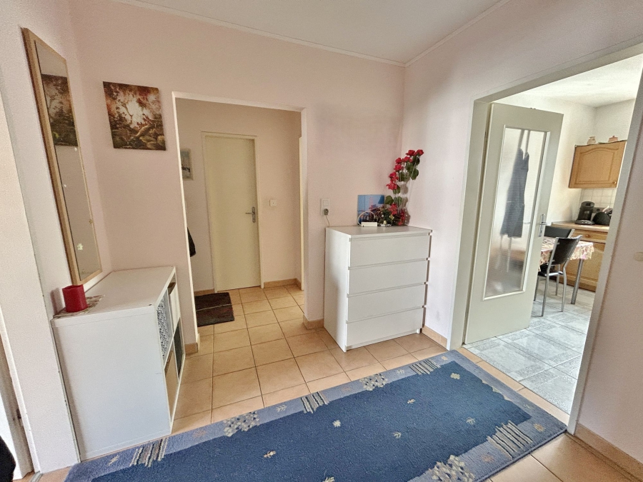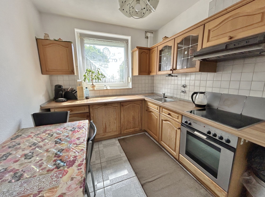 Über das gemeinschaftlich genutzte Treppenhaus gelangen Sie zu Ihrer neuen Wohnung. Vom Eingangsbereich der Wohnung erreichen Sie einen kleinen Abstellraum, welcher sich ideal für Staubsauger, Bügelbrett u.ä. eignet, sowie das Wohnzimmer und die Küche. Die Küche wurde von den jetzigen Mietern mit eigenen Einbauten versehen und bietet Platz, um einen Frühstückstisch zu stellen.