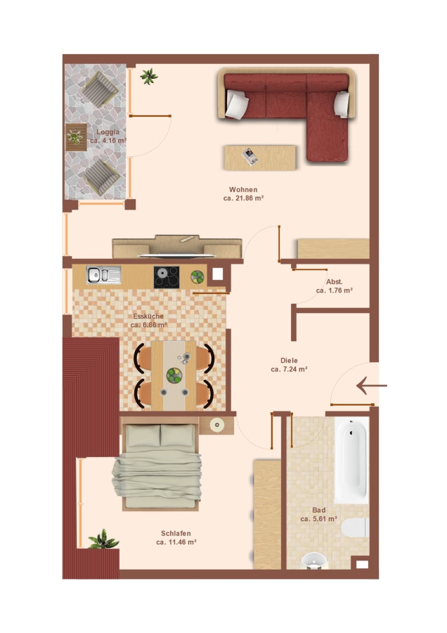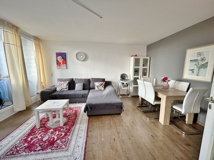 Das Wohnzimmer bildet zur rechten Seite den Lebensmittelpunkt der Wohnung. Hier ist genügend Platz für eine große Wohnlandschaft und auch den Esstisch für die Familie. Hiervon abgehend gelangen Sie auf die Loggia, auf der windgeschützt der Feierabend verbracht werden kann.