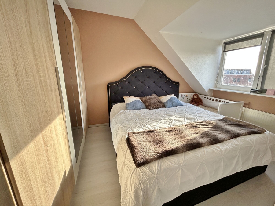 Ebenfalls zur linken Flurseite befindet sich das Schlafzimmer, welches durch eine kleine Dachschräge ein gemütliches Flair bekommt und dennoch genug Stellwände vorweisen kann.