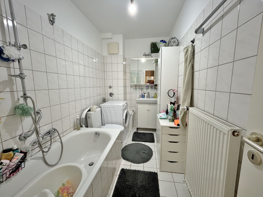 Zur Linken befindet sich direkt das Badezimmer, welches mit hellen Fliesen und einer Badewanne inklusive Duschabtrennung ausgestattet ist. Zudem ist hier der Waschmaschinenanschluss vorgesehen.