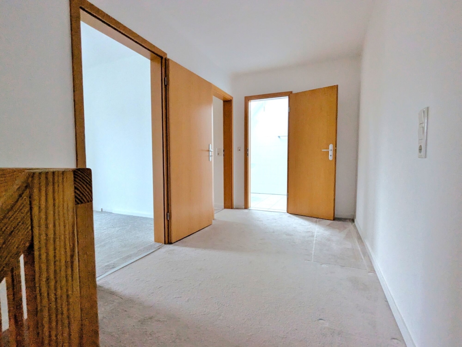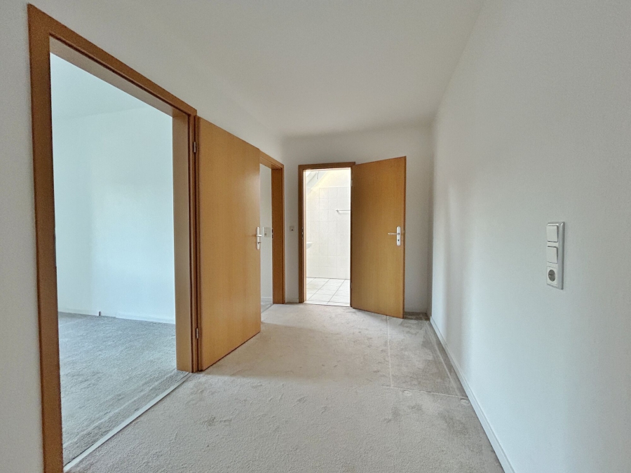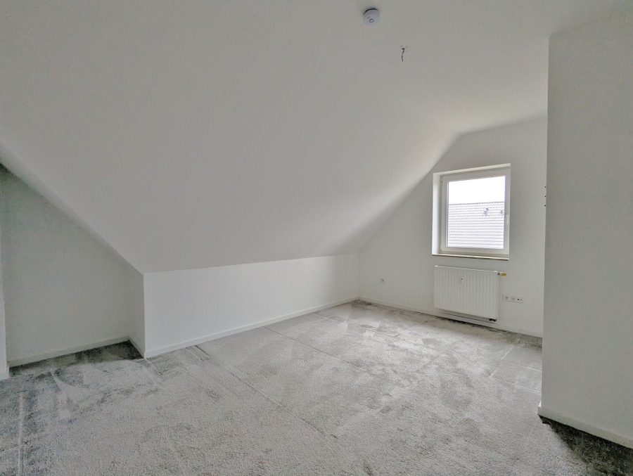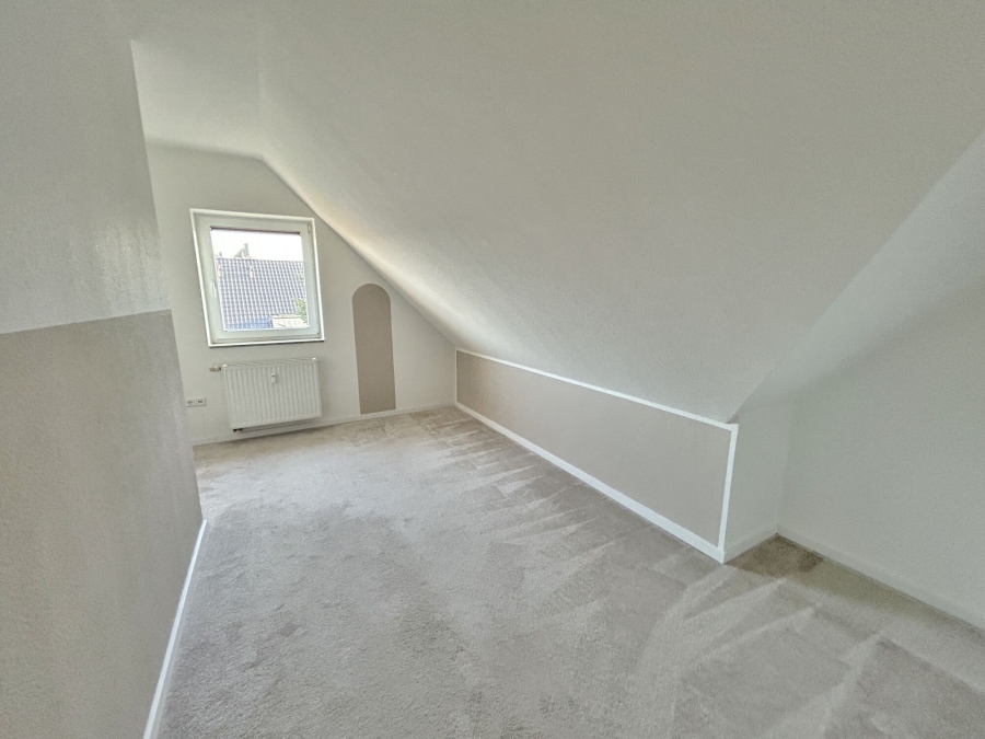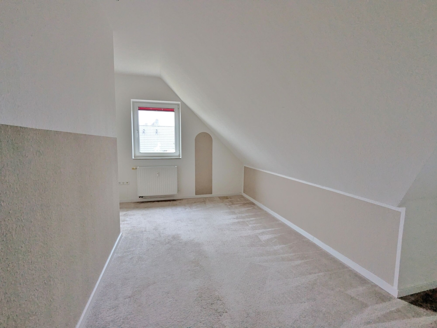 Über eine Holztreppe gelangen Sie in das ausgebaute Dachgeschoss, wobei der Platz unter der Treppe als praktische Abstellfläche dient. Im Dachgeschoss finden Sie zwei Schlafzimmer und das zweite Duschbad mit Velux-Fenster. Der Teppichboden in hellbeige kombiniert mit den Dachschrägen verleiht dieser Etage ein gemütliches Ambiente. Durch die zwei Ebenen sind der private Bereich der Wohnung und der für Ihren Besuch wunderbar voneinander getrennt.