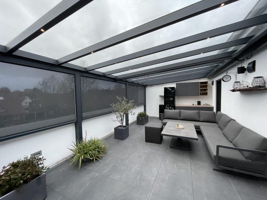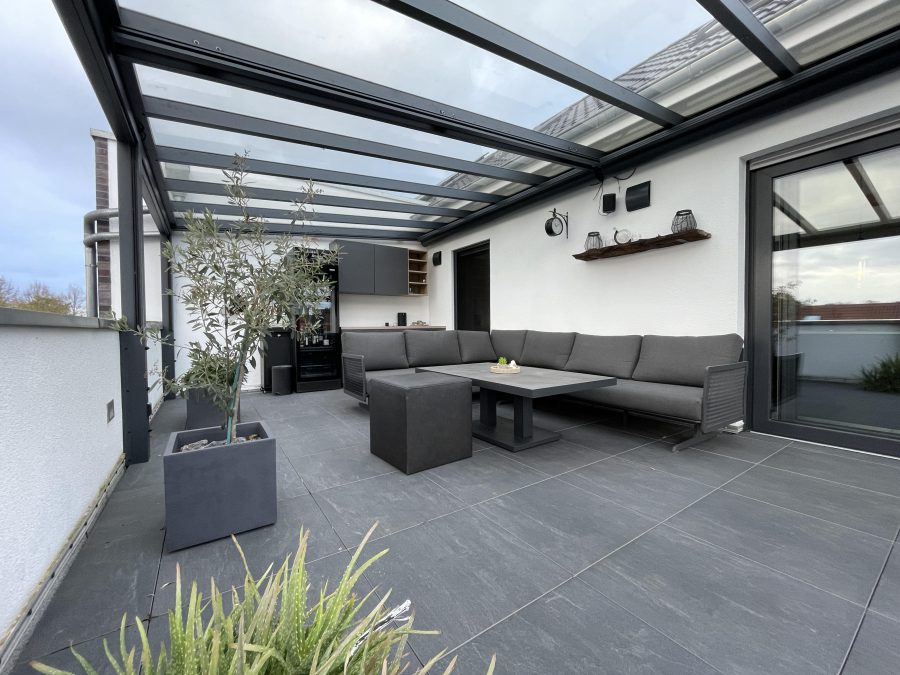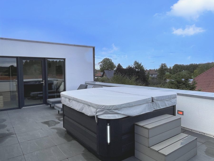 Ein echter Höhepunkt dieser Immobilie offenbart sich jedoch im Außenbereich. Die großzügige Dachterrasse ist nicht nur ein Freisitz, sondern ein exklusiver Outdoor-Wohnraum. Sie gliedert sich in eine stilvolle Loungezone, die mit ihrer atmosphärischen Attika-Beleuchtung den Sommerabenden eine besondere Stimmung verleiht, und in einen luxuriösen Wellnessbereich. Hier befindet sich ein hochwertiger Jacuzzi, flankiert von einer abgetrennten Sauna mit eigenem Duschbereich – ein privates Spa mit Blick über die Dächer und in den Himmel über Lemförde. Die überdachte Außenterrasse, ausgestattet mit einem Zip-System als Wind- und Wetterschutz, macht diesen Bereich nahezu ganzjährig nutzbar.