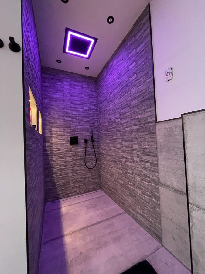 Die privaten Wohnräume setzen die hochwertige Gestaltung konsequent fort. Das Hauptschlafzimmer beeindruckt mit maßgefertigten Einbauschränken, die Eleganz und Funktionalität perfekt vereinen. Weitere, individuell angefertigte Einbauten im Flur und Hauswirtschaftsraum sorgen für eine klare Ordnung und ein durchgängig stimmiges Erscheinungsbild. Das Badezimmer schließlich ist eine architektonische Komposition aus Komfort und Design: eine großzügige Walk-in-Rainshower, eine geschmackvolle Badewanne und charmant integrierte, indirekt beleuchtete Nischen, die den Raum in ein ruhiges, fast schon Spa ähnliches Licht tauchen.