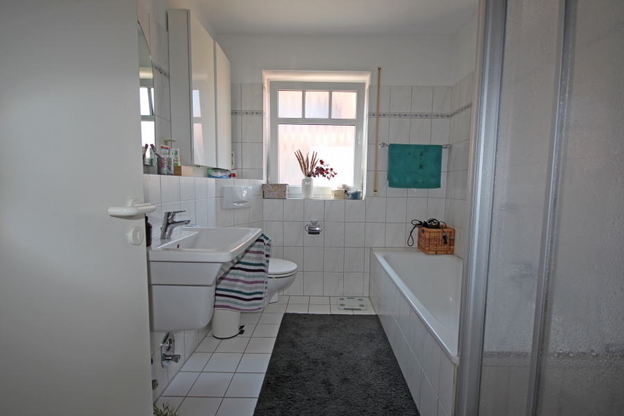 Neben der Küche mit komplett ausgestatteter Einbauküche und dem hell gefliesten Badezimmer mit Wanne, Dusche und Fenster finden Sie außerdem noch den praktischen Hauswirtschaftsraum mit Waschmaschinenanschluss.