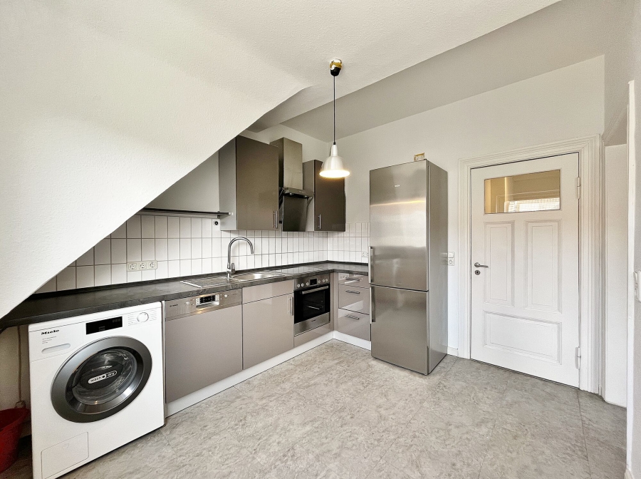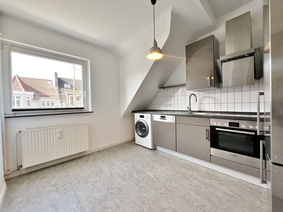 Die modern ausgestattete Küche lässt mit ihren hochwertigen Elektrogeräten keine Wünsche offen und bietet darüber hinaus ausreichend Platz für einen gemütlichen Essbereich – ideal für gesellige Stunden.