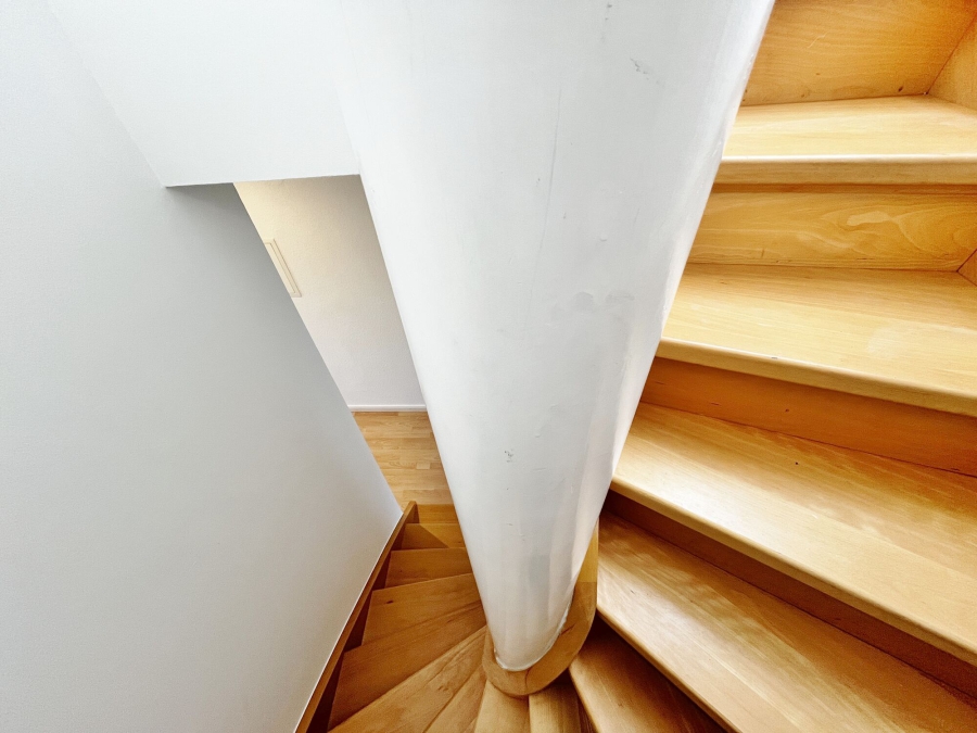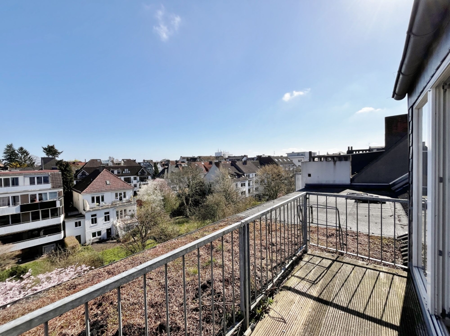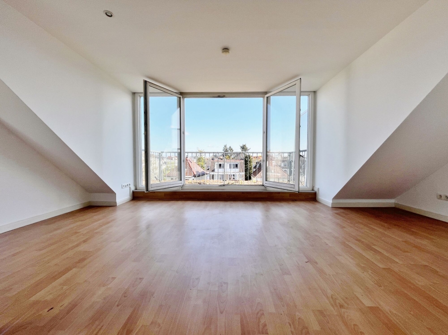 Ein ganz besonderes Highlight dieser Wohnung ist das charmante Atelierzimmer mit Zugang zur kleinen, feinen Dachterrasse. Es ist über eine Holztreppe ins Dachgeschoss erreichbar. Von hier aus genießen Sie einen traumhaften Blick in den grünen Innenbereich sowie über die Dächer des beliebten Viertels. Die großzügige, zweiflügelige Terrassentür durchflutet den Raum mit Licht und sorgt für eine herrlich luftige Atmosphäre. Ergänzt wird dies durch praktische Fliegengitter sowie Veluxfenster mit Verdunkelungsrollos. So lässt sich der Raum vielseitig nutzen – ob als Arbeitsbereich, Rückzugsort oder kreatives Atelier.